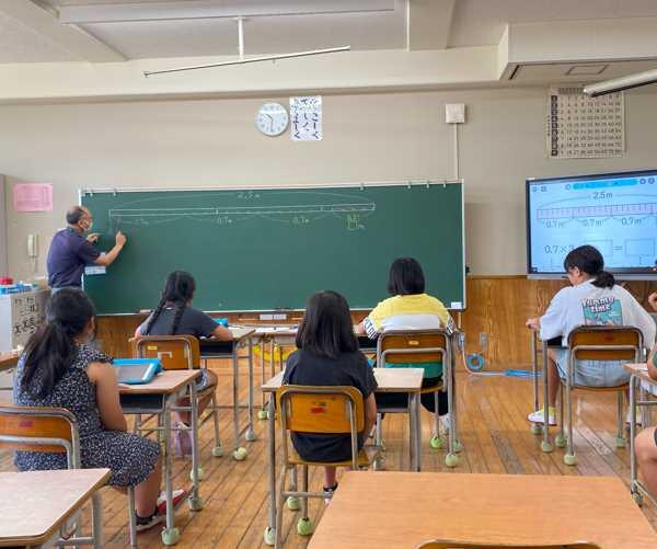 5年生は算数で小数の割り算の学習をしています。次のような問題です。「2.5mのリボンを、1人に0.7mずつ配ります。何人配れて何mあまりますか?」この問題ではあまりの表し方がポイントになります。答えは「3人配れて4mあまる。」でいいのでしょうか。子どもたちの話し合いが始まります。子どもたちはテープ図を使って説明し、あまりは4mではなく、0.4mになることに気が付きました。算数では、図をかくなどして根拠のある立式や答えを導き出すことが大切です。なぜ、そうなるのか?に対して、「何となくです。」では困ります。図などに示して、相手にわかりやすい言葉を使って説明する力を高めさせていきます。