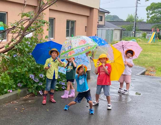 熊本地方は先日、例年よりかなり遅れて梅雨入りの発表がありました。今日は、梅雨らしい雨がしとしとと朝から降り続いています。そんな中、1年生が校庭を傘をさして歩きながら生き物さがしをしていました。晴れた日とはちがう発見があったのでしょうか。元気いっぱい笑顔で活動する様子がありました。子どもたちにとっては雨の日もわくわくがいっぱいなようです。