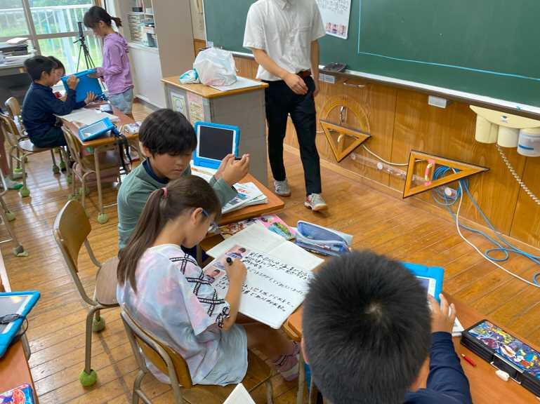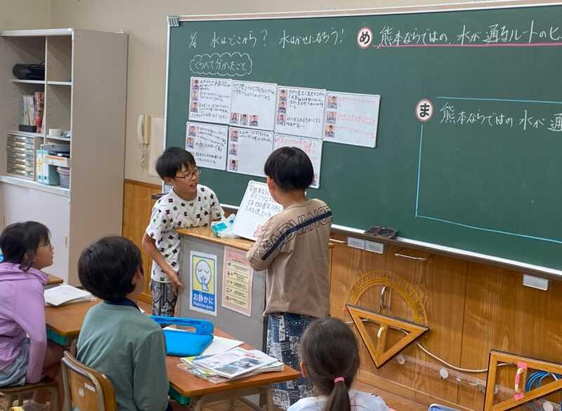 4年生は「水はどこから?~熊本の水博士になろう~」という学習をしています。蛇口をひねれば、いつでも好きなだけ当たり前に水が出てくる生活を送っている子どもたちです。その水はどこから、どのように供給されているのか考えたことがある子どもは少ないようでした。だからこそ、子どもたちは学習課題に取り組む意欲が高まります。資料をもとに、学校や家庭に水が届くまでの秘密を資料をもとに考えました。そして、熊本県は他県と違い、その多くが地下水であることに気づきました。蛇口をひねればミネラルウオーターが出てくるのです。この授業を通して、ふるさとを熊本を誇りに思う気持ちも高まったようです。
