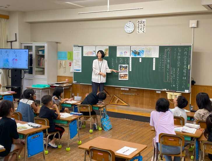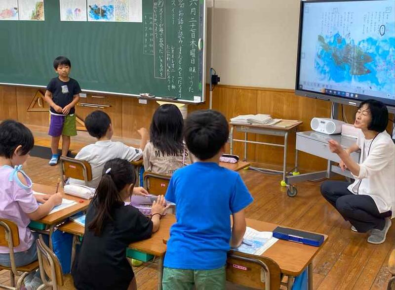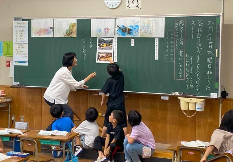 教材は、レオ・レオニさんの不朽の名作「スイミー」です。だれもが一度は読んだことのある物語ではないでしょうか。スイミーは物語の中で数々の生き物と出会います。それらの生き物の様子や海の様子を「~のような」「~みたいな」などの比喩表現に着目して想像する学習でした。また、色彩表現も、この作品のすばらしさの一つです。子どもたちは言葉を手掛かりにして、色鮮やかな海や生き物を頭の中に描いていたようです。廊下には、レオ・レオニさんの他の作品も自由に読めるように準備がしてありました。たくさんの作品のすばらしい表現や描写にふれることで心を豊かにしてほしいと思います。