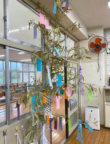 今日も雨がふり、じめじめとした天気でした。しかし、今日から7月です。夏休みまでもう少しという気持ちで元気いっぱい学校生活を楽しんでいます。校内をめぐっていると七夕かざりがしてありました。子どもたちはどんな願い事をしているのかなと思い、しっかり見てみると、家族の健康、学業のこと、スポーツのこと、友達のこと、世界平和のことなど様々ありました。願い事からも八幡小の子どもたちはみんな優しく、賢く、思いやりのある子どもたちだなあと感じました。