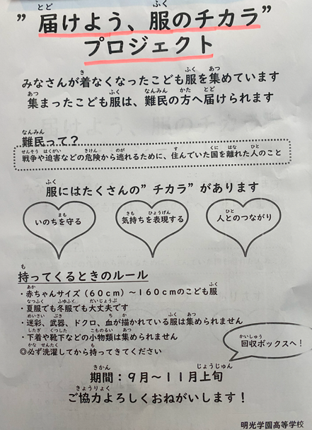 大牟田の明光学園高等学校の学生さんが、“届けよう!服のチカラ”プロジェクトへの協力依頼に来てくれました。このプロジェクトは、着なくなった子ども服を回収し、難民キャンプへ送るというものだそうです。高校1年生の家庭科の学習の一環として、このプロジェクトに取り組まれています。本日、協力依頼のプリントを児童を通じて配付しました。趣旨をご理解の上、ご協力いただけるとありがたいです。衣類の回収ボックスは昇降口の前に設置します。朝、登校したときにボックスに入れてもらいます。どうぞ、よろしくお願いします。