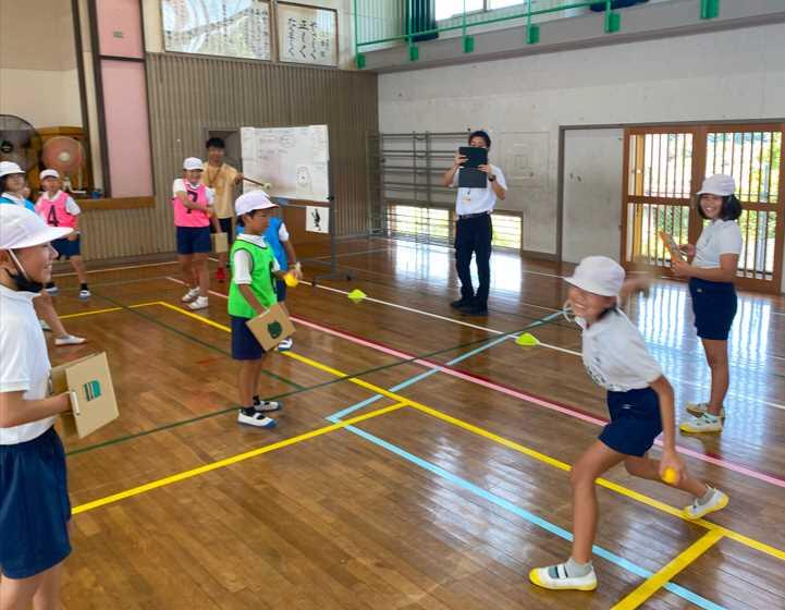 テニピンとは、テニスとピンポンを掛け合わせた、新しい運動です。ラケットは段ボール製で、野球のグローブように直接、手にはめます。コートはバドミントンコートほどの広さです。今回の授業では、相手コートに打ち返すためにはどのような動きをするとよいか、友達と思考錯誤しながら考えました。そして、打つタイミングやラケットの振り方を言語化して、ゲームを楽しみました。応援の声もたくさん聞かれました。今後、ルールもみんなが楽しめるよう簡素化するなど、子どもたちの想いを活かしながら柔軟に工夫されていくそうです。