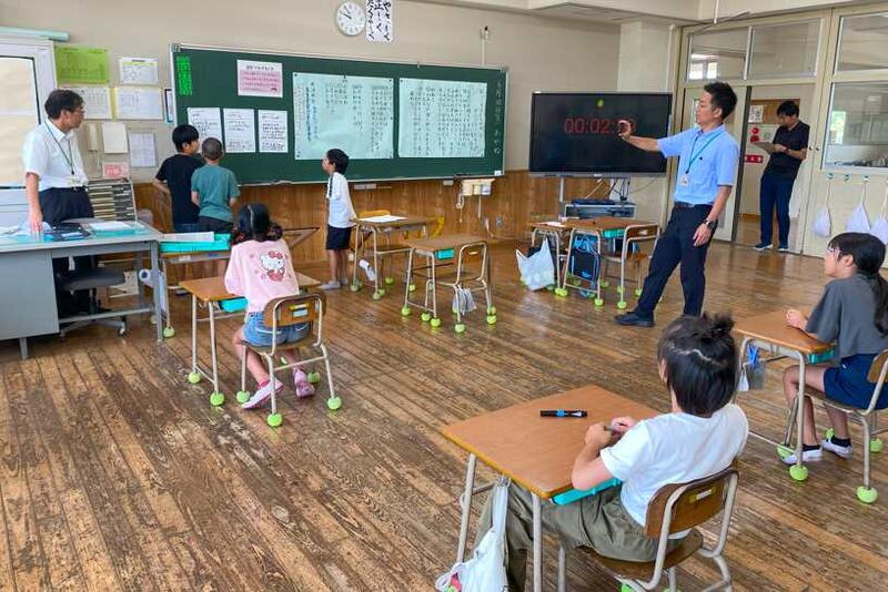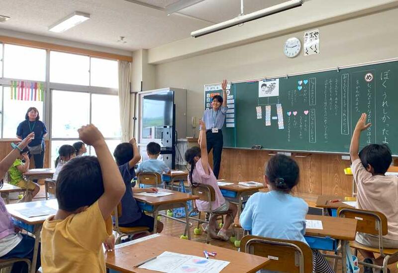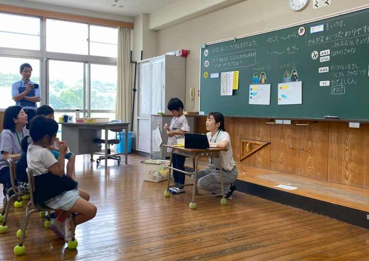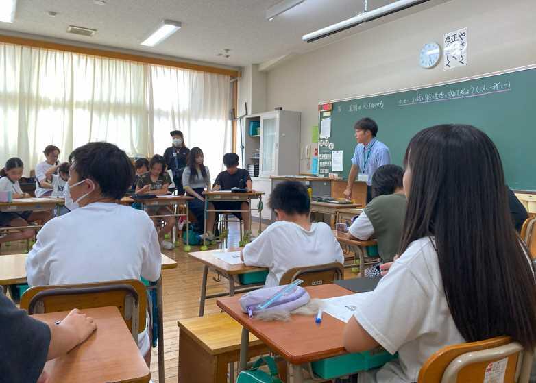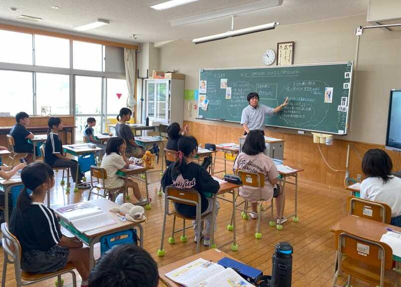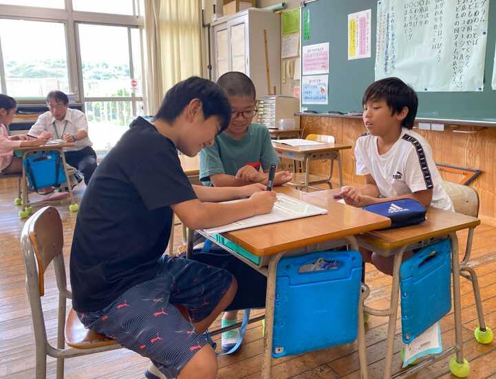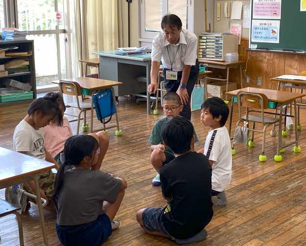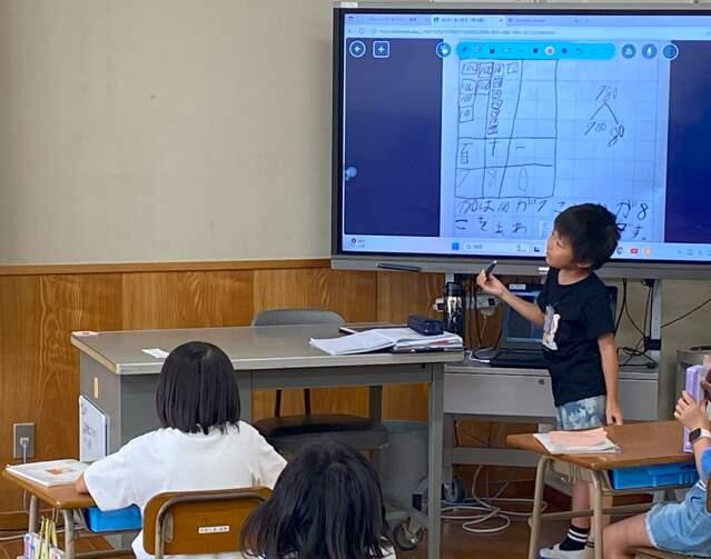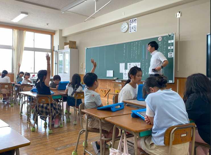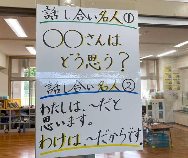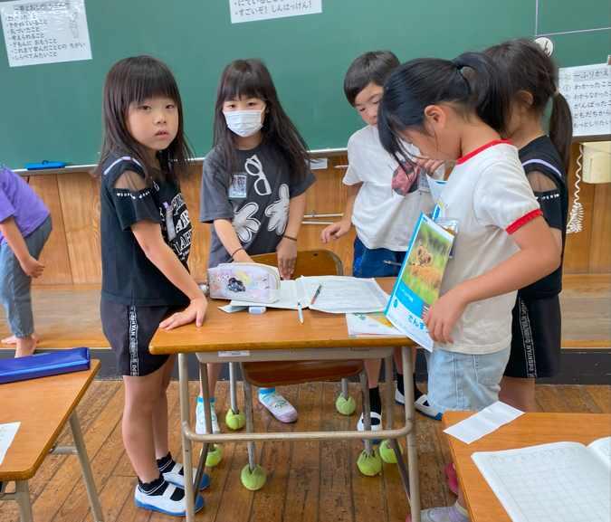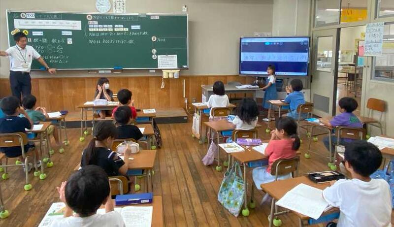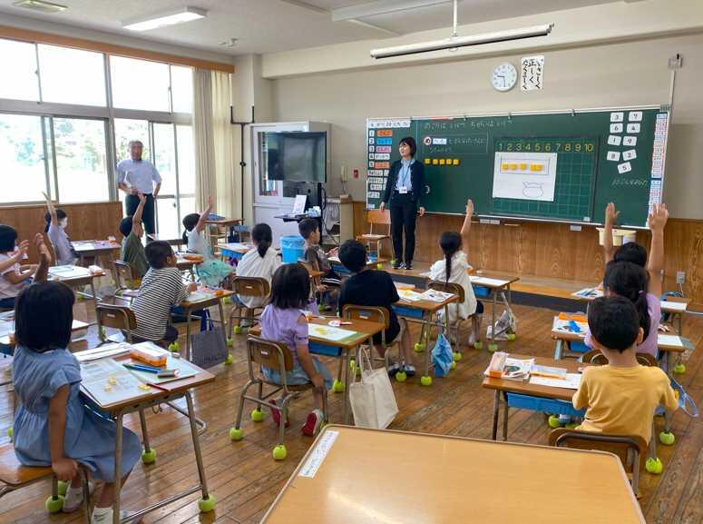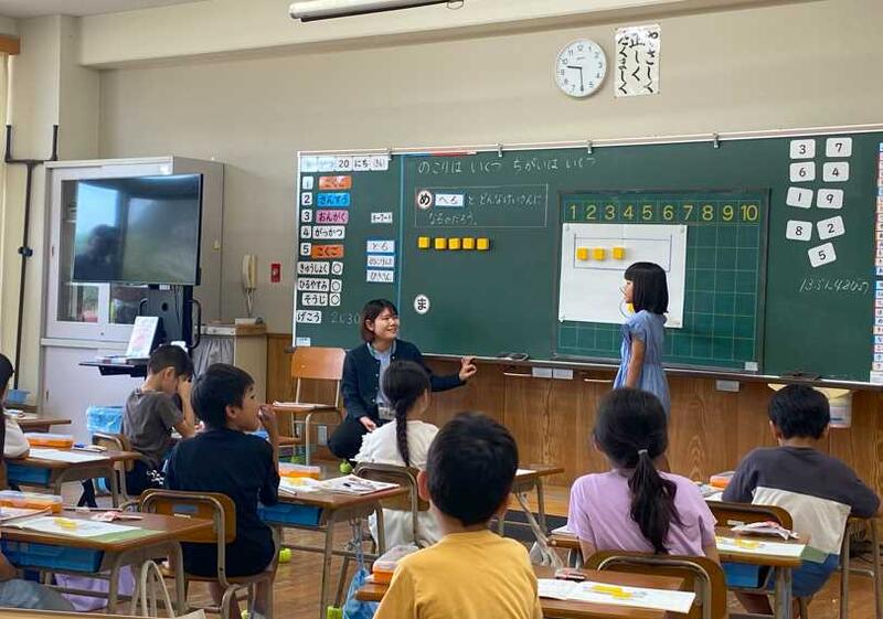 1年生で算数の公開授業がありました。1年生はこれまで、たし算の学習を行ってきましたが、今回はじめてひき算に挑戦しました。まずは「減る」ということを具体物(ブロック)を使って操作しながら理解していきました。次にブロックを○の形に置き換えて考え、最後に数字をつかった「5-2」という立式をして、答えは3と正しく導き出すことができていました。吉田先生はペアやグループで考える中で「いちねんせいのすてきなことば」を大切に話合いをするように声かけをされていました。話合いの中で「いいね。」「○○さんはどう思う?」などたくさんの温かい言葉が飛び交っていました。