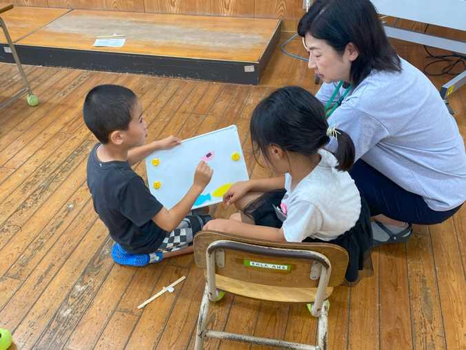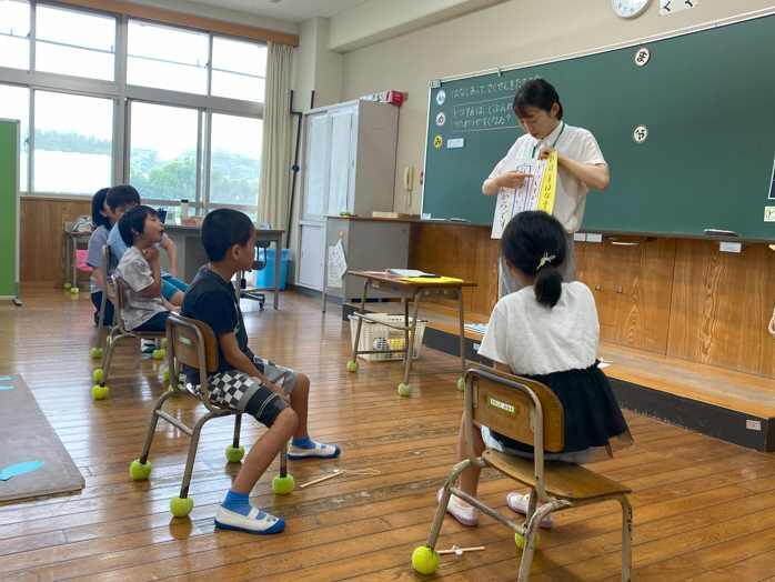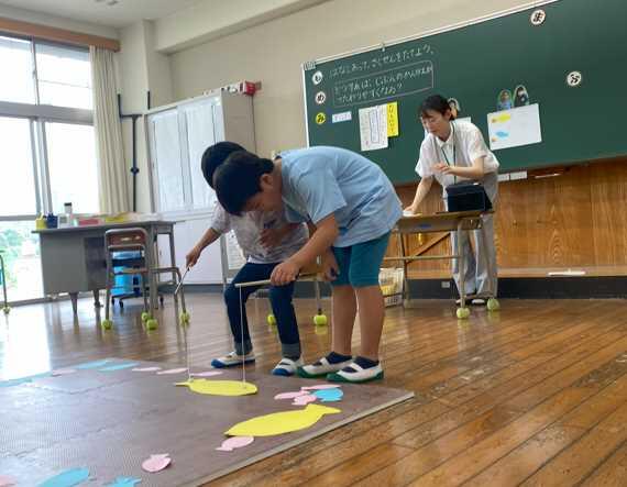 さくら学級で自立活動の公開授業が行われました。道喜先生は魚釣りゲームを通して、友達と話し合って作戦を立てたり、友達と共に活動を楽しんだりすることをねらいとされました。魚には小型、大型、超大型の魚が混じっており、大きさによって点数が異なります。また、小型の魚は一人でも釣り上げることができますが、点数の大きい大型の魚は友達と協力しなければ釣り上げることができないようにルールを工夫してありました。必然的に子どもたちは友達と話し合いを始めます。「こうしたらいい。」だけでは自分の考えが十分に伝わりません。なぜ、そうするのかわけを加えて話合う様子がありました。振り返りの時間には、互いに友達のがんばりやよさを伝えあいました。活動の楽しさだけではなく、お互いのよさに気づくことができたようでした。