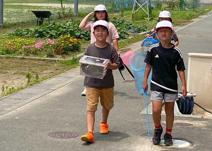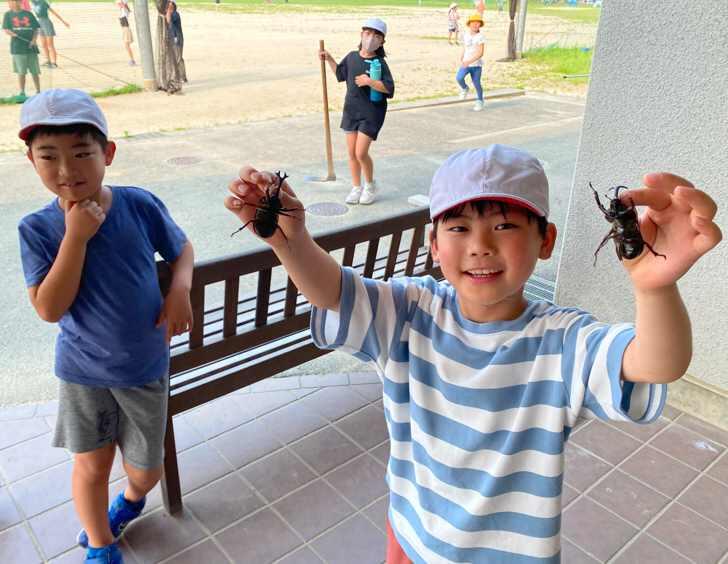 低学年の子どもたちを中心に朝の時間や生活科の授業、昼休みなど暑さに負けず、生き物さがしに夢中です。虫あみと虫かごをもった子どもたちをたくさん見かけます。八幡小の校庭にはツマグロヒョウモンチョウやアゲハチョウの幼虫、ダンゴムシ、バッタにカマキリなどたくさんの生き物がいるようです。今朝は3年生の子どもたちが運動場で立派な角を持ったカブトムシを2匹捕まえたと見せてくれました。