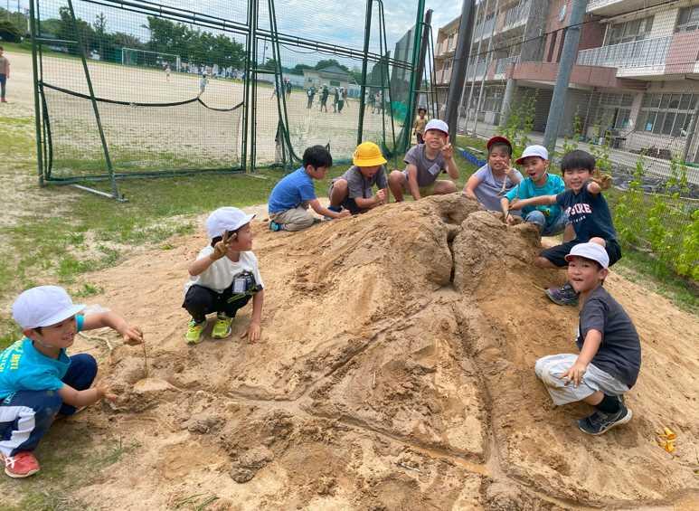 朝の時間や昼休みに砂山で遊んでいる子どもたちをたくさん見かけます。学年・男女関係なく協力しあいながら楽しんでいます。山を作ったり、トンネルを掘ったり、水の通り道をつくったりと子どもたちの顔は生き生きとしています。「あぁしよう。」「こうしよう。」とアイデアを出し合ったり、意見をぶつけ合ったりしています。砂、土、泥の匂いや手で触った感覚など遊びを通して学ぶものもたくさんあるのではないでしょうか。時代は変わってもこんな遊びでわいわいとにぎわっている様子をみて、微笑ましくうれしい気持ちになりました。洋服が泥だらけになっているお子さんもいるかもしれません。叱らずに、遊びの様子をたくさん聞いてあげてください。