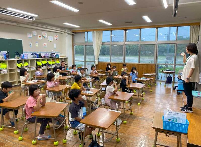 今日からフッ化物洗口が始まりました。子どもたちの歯の質を強くし、虫歯を予防する取組です。濱口さん、菊川さんには洗口液の作製や洗口実施の補助などで大変お世話になります。今日は1年生も上手に口を動かしてうがいすることができました。フッ化物洗口は毎週火曜日の朝に実施します。