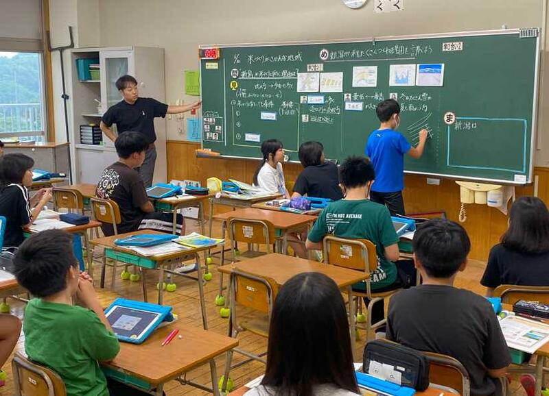 5年1組で社会科の公開授業がありました。中村先生はどの授業でも、子ども主体の学習となるように子どもたち自らが「問い」を生み出す工夫をされています。今回の授業では、米づくりが盛んな新潟県について考えました。新潟県には、きっと米作りに適した「自然のヒミツ」があるのではないか。どんなヒミツがあるのだろうと「問い」を立て、様々な資料をもとにして自分の考えを書いたり、伝えたりしました。今、世の中では「米不足」「米の価格高騰」「備蓄米」など米に関するニュースが毎日流れています。教科書の学習と実生活を結び付け、学びを進めていくとさらに深い学習になるのではないでしょうか。