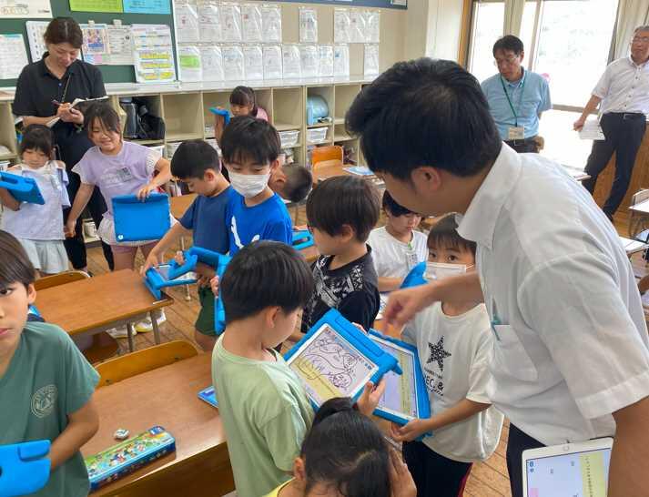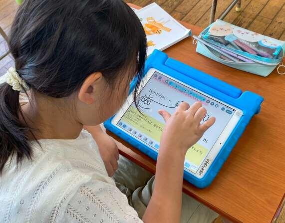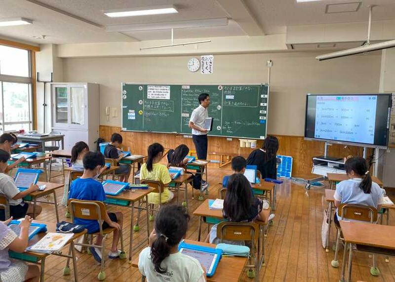 3年1組で算数の公開授業がありました。本時の問題は1km100m-800mでしたが、二つの単位が混ざっている場合、単位をそろえて計算する必要があります。算数の授業は一般的に①自力解決→②協働解決(グループ)→③全体共有・交流(学級)という流れで展開していきます。②③の活動を充実させるためには①の自力解決の時間が大切になります。坂本先生は自力解決を充実させるために様々な工夫をされていました。自力解決の前に全員が解決の見通しを持てるよう、キーワードを提示したり、ロイロノートの活用したりされていました。子どもたちは協働的な学びを通して1km=1000mを使い計算をすればよいことに気づき、正しく計算することができるようになりました。