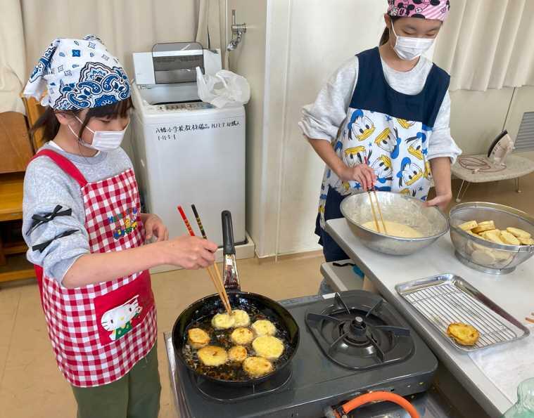 5年生が学級園で収穫したさつまいもを使って料理に挑戦しました。「大学いも」「いものてんぷら」「いも餅」「いもチップス」など友達の協力しながら楽しそうに調理する様子がありました。少し、試食をさせてもらいましたが、とてもおいしかったです。家庭でもチャレンジしてみるといいですね。