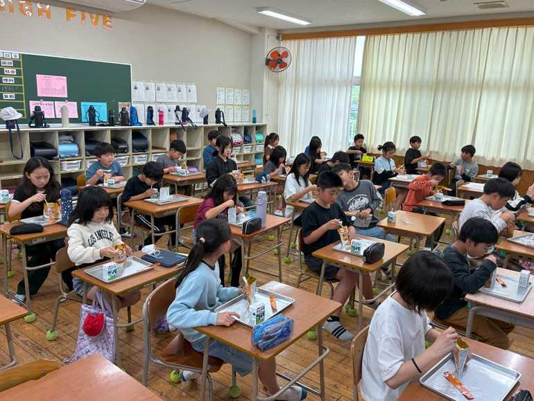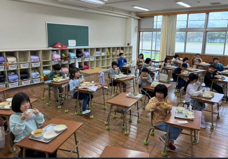 今日から1年生も登校班にまじって自分の足で歩いて登校しました。朝方まで激しい雨が降っていましたが、登校の時間は雨もあがり、良かったです。上級生が1年生の歩くペースに合わせたり、安全を確認したりしながら、優しく声掛けをする様子がありました。保護者や地域の方々の見守りもあり、大変ありがたく思います。また、給食も始まりました。初めての給食のメニューはカレーライスと唐揚げ、野菜サラダ、牛乳でした。みんなおいしそうに食べていました。好き嫌いなくたくさん食べて、丈夫な体をつくっていきましょう。