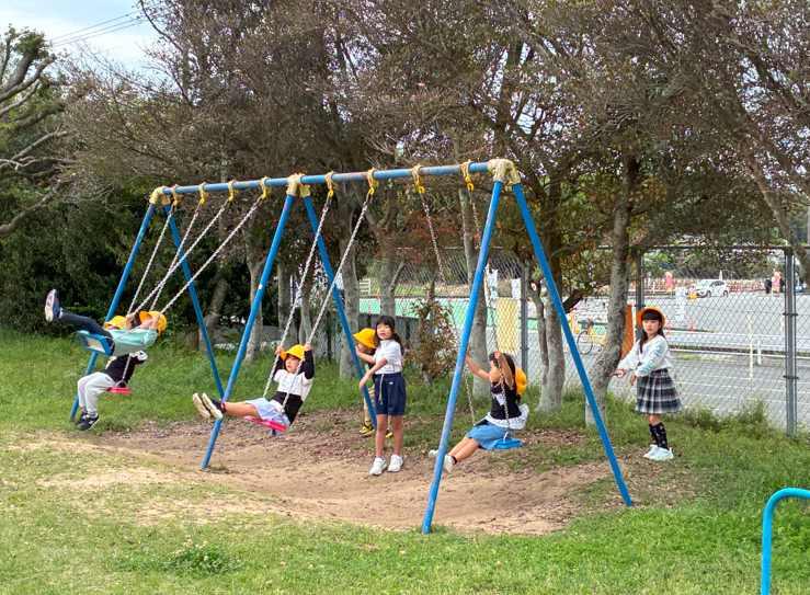 子どもたちは朝学校に来ると、外に出てサッカーやドッジボール、虫さがしなどみんなで仲良く、元気よく遊んでいます。そんな中、1年生がブランコ遊びを楽しんでいました。友達と順番を譲り合いながら、また背中を押してあげたり、こぎ方を教え合ったりしながら楽しんでいました。学校では教科書を通した学習だけでなく、このような遊びを通しても社会性を身に付けていきます。