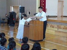 各学年の児童代表が、1学期がんばったことや思い出と題して発表では、1年生代表の子どもは、「運動会やプールを一生懸命頑張りました。2学期は算数で100点取ります。」と力強く発表しました。3年生代表の子どもは、「1学期は温かいクラスづくりに取り組みました。でもまだまだよくしていきたいです。そのためにも、2学期は自信をもって手をあげれるようになりたいです。」と反省からこれから目指したい自分たちの姿がみえる言葉を残してくれました。最後に、5年生代表の子どもは、「童話発表会で、学校代表を目指して頑張りました。来年こそ達成したい。」と次の目標に向けた決意を発表してくれました。