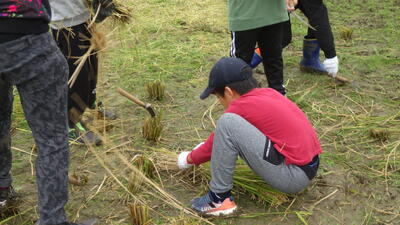 10月25日(金)に稲刈りを行いました。初めて体験する児童も多く、みんな楽しみにしていました。JAの方から鎌の使い方を教わりながら稲刈りをしました。初めは不安そうな顔になりながら鎌を使っていましたが、次第に慣れてきて、どんどん作業を進めることができました。「おじいちゃんの家でも米づくりをしているので、手伝いたい」と述べる児童もおり、貴重な体験をすることができました。