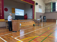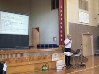 山田小学校では、朝の全校集会で「防災」について考えました。安全教育担当から熊本地震や令和2年豪雨災害などの自然災害について、栄養教諭から非常食について話がありました。