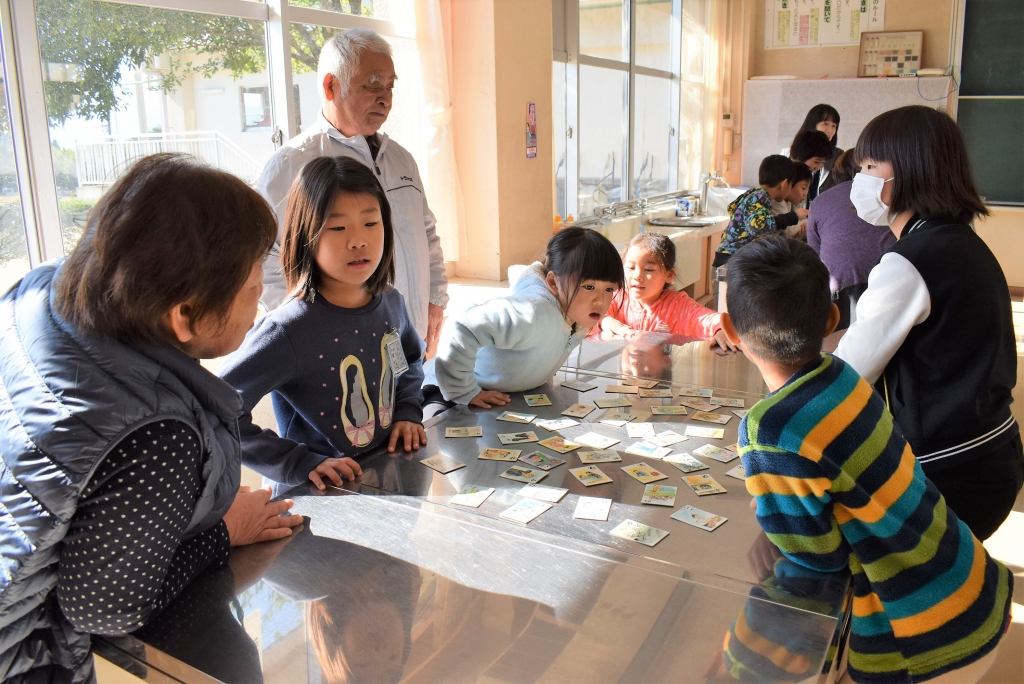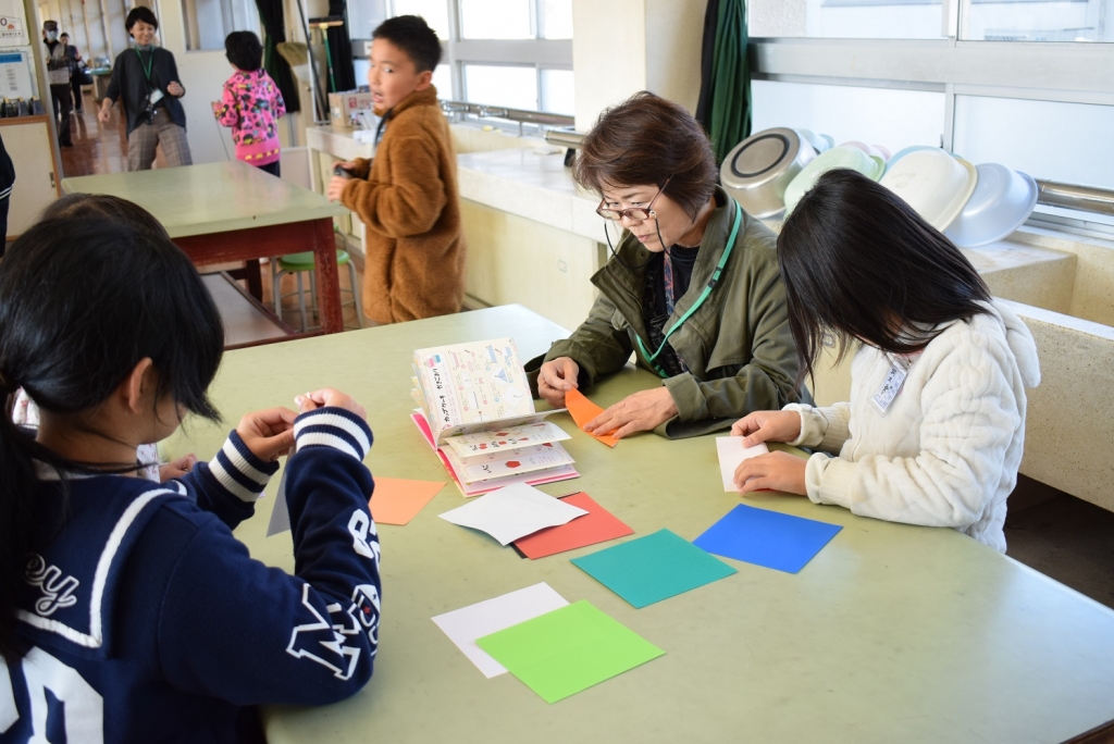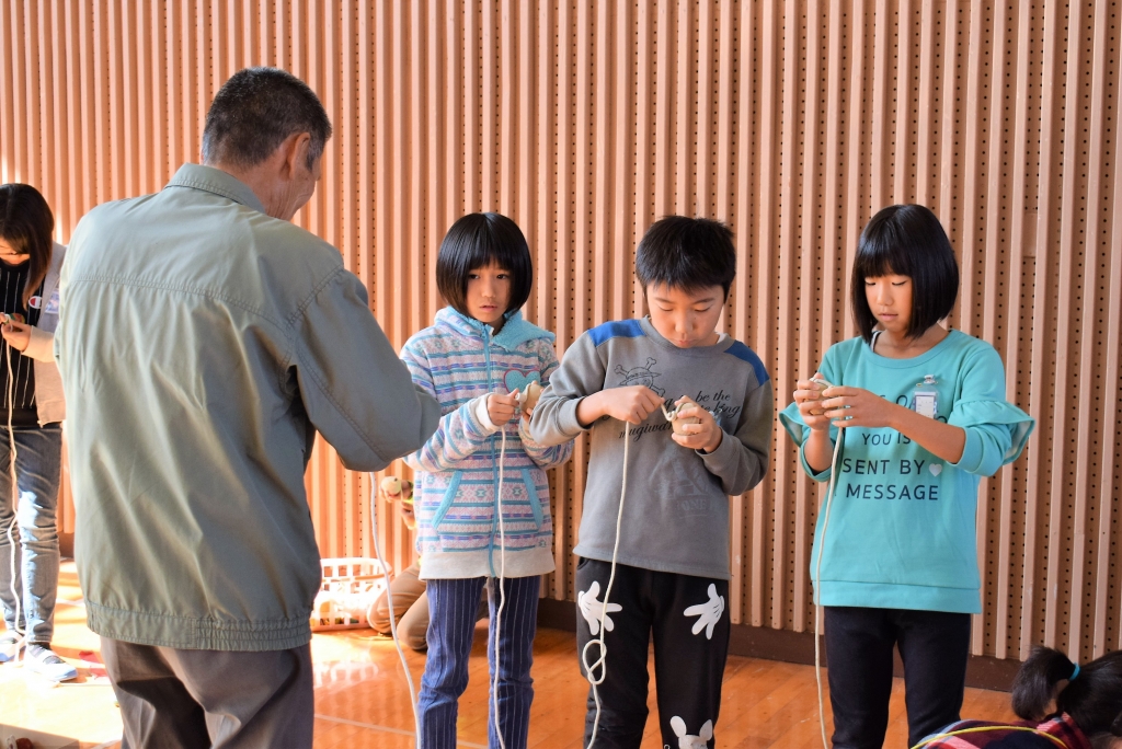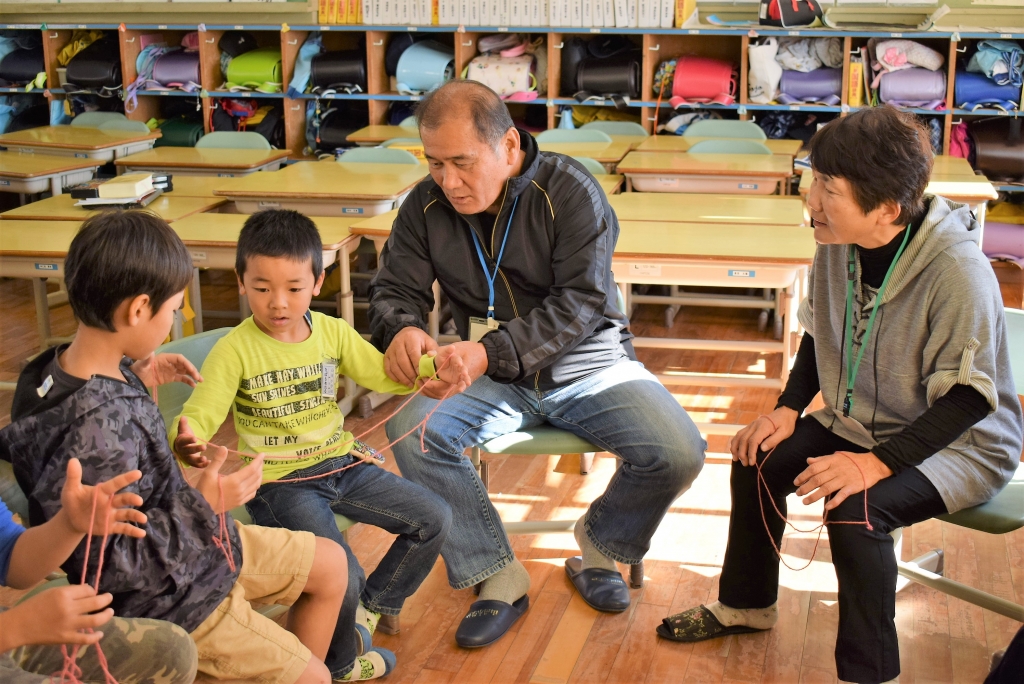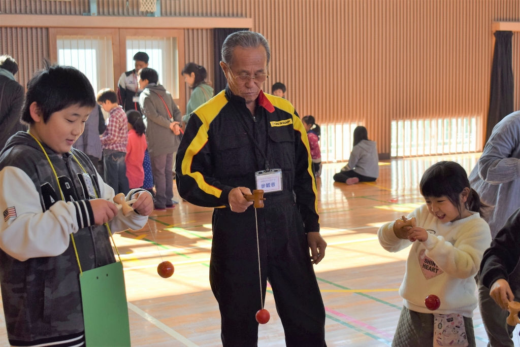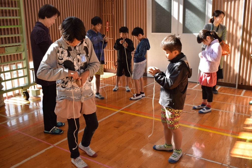 「かもつ列車・わらべ歌遊び」をした後に、縦割り班に分かれて「①折り紙、②とんとんずもう、③あやとり、④ふく笑い、⑤お手玉、⑦おはじき、⑧けん玉、⑨絵しりとり、⑩コマ回し」を行いました。