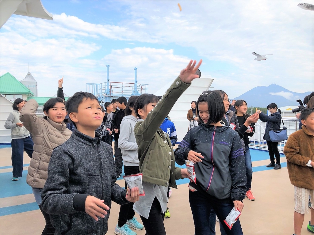 たくさん空を飛んでいるカモメに、みんなでえさをあげました。