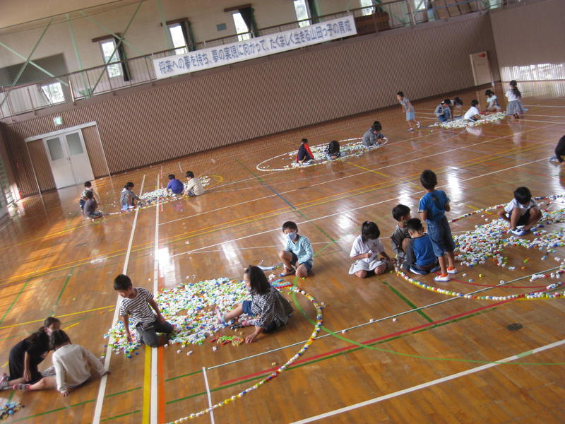 体育館いっぱいに子ども達は楽しく作っていました。大きなカタツムリや生き物を作っていました。