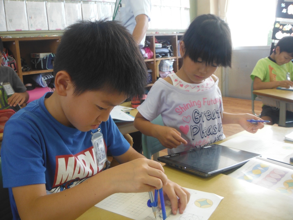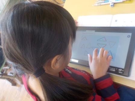 子どもたちは、タブレットPCに提示された円の中に直線をひく活動をとても意欲的に行っていました。子どもたちにとって、タブレット上では、紙やノートに鉛筆で直線を引くのとは違い、簡単に、正確に直線をひくことができるというメリットがあります。一人で何回もパズルづくりに挑戦していました。