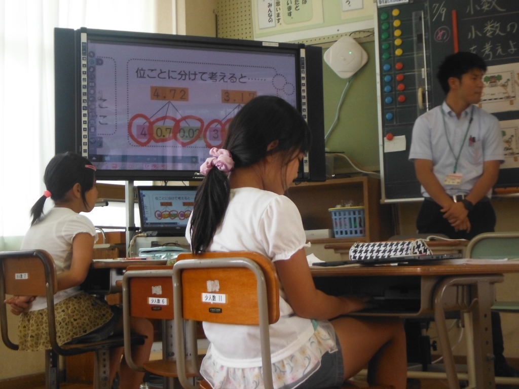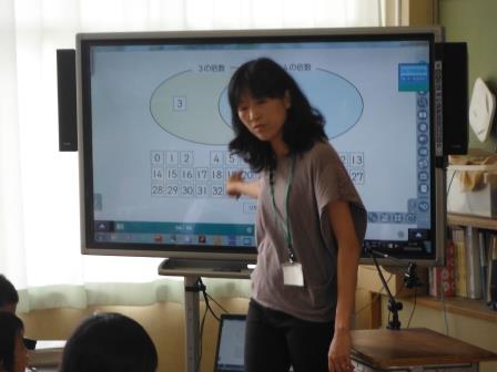 初任者研修の授業として、5年生の古賀先生が算数の授業をされました。今回はタブレット端末を使って、○の数の求め方を考え、その式になった理由を説明する授業でした。子どもたちはそれぞれに考えた求め方をタブレット端末に書き込み、画面転送システムを用いてみんなに分かりやすく説明することができました。
