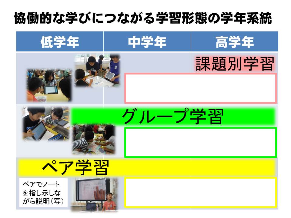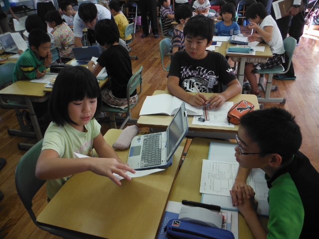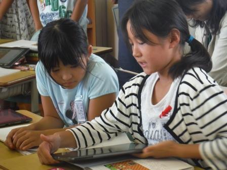 子どもたちはタブレットPCをくいいるように見合い、グループで積極的に伝え合う様子が見られました。ペン書きや拡大等の機能は、グループ思考の場面での「考えの共有」に大変効果的でした。