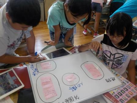 グループでの活動場面では,3人に一台のタブレットPCを使い、個人思考の場面で考えたことを、グループで広げ・深めていきました。