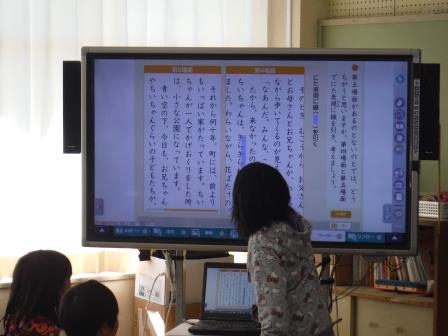 全体での学びの場面では,電子黒板を活用しました。電子黒板上での説明は、視覚的にポイントをとらえやすく、児童の理解を深めることに適しています。