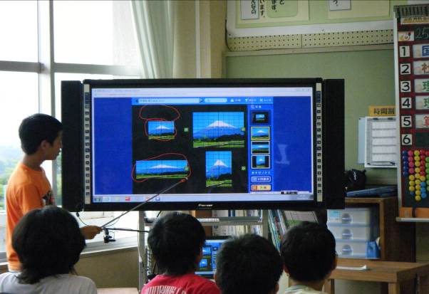 プレゼンテーション資料を電子黒板で提示し、「驚き」「葛藤」「困惑」「矛盾」を持たせることで、『なぜ、日本と中国、日本とロシアは戦争をしたのか』という問いを子どもたちから引き出したり、練り上げる場面では、電子黒板やタブレットPCに、自分の考えの主張点を書き込ませながら伝え合うことで、「考えを共有」した授業でした。
