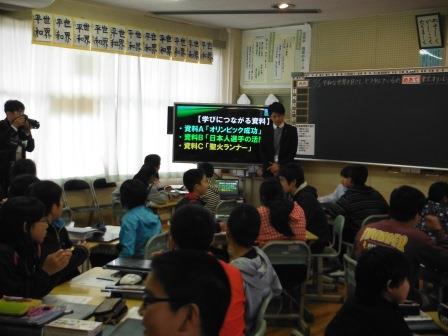 12月2日(火)に平成26年度「わくわく授業プレゼンター」活用事業の小学校社会科が山田小学校で行われ、人吉球磨管内から25名ほどの先生方が参観されました。今回は「平和な世界を目ざし,どう歩んでいるの」の単元で、東京オリンピックが日本にもたらした影響について考える授業でした。子どもたちの学習に臨む姿勢や協働的に学び合う姿にたくさんの先生方からおほめの言葉をいただきました。大変お忙しい中、参観していただいた先生方、本当にありがとうございました。