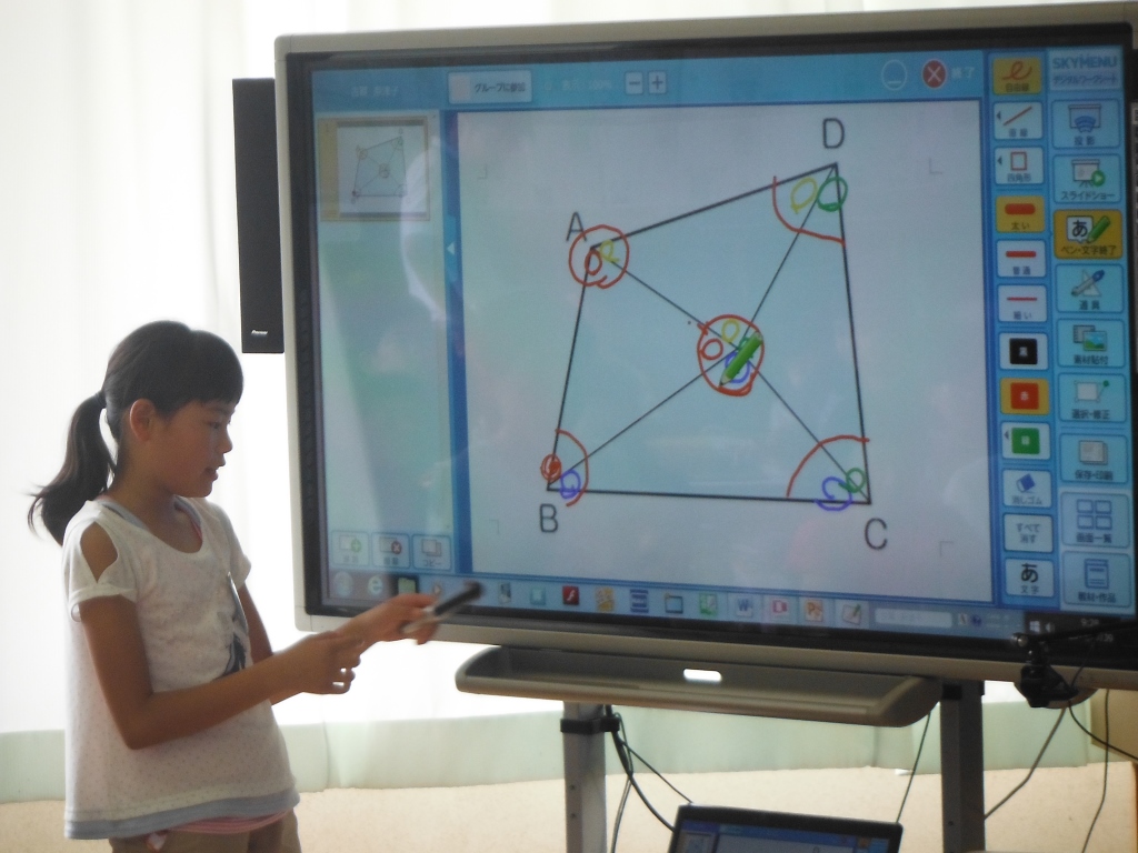 電子黒板に課題として提示した図形を写し出し、説明をし合いました。友達の考えにそれぞれ付け加えたり、反対したりしながら、考えの共有を図ることができました。