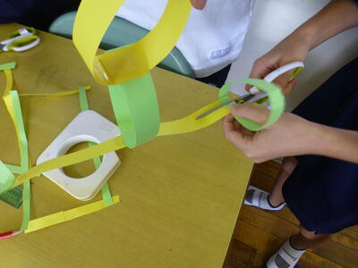 丸くつないだ2つ輪を十字に重なるように張り付け、それぞれの輪の幅を半分になるように切ると・・・・