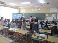 先生の話と電子黒板を見ながら自分で操作していきます。 学級のみんなの顔が映って大喜びです。