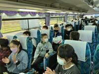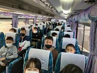 バスの車内では、バスガイドさんの話で楽しく過ごしています。