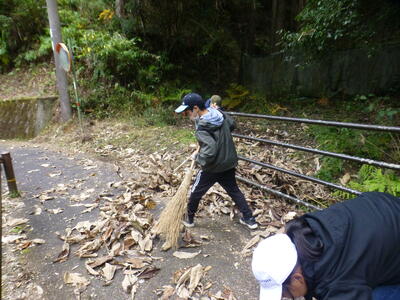 11月19日の昼休みとボランティアの時間を使って、六年生が元気坂に落ちている落ち葉の掃除をしました。