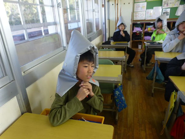 また、余震が起こったと想定し、防災頭巾を被って訓練もしました。