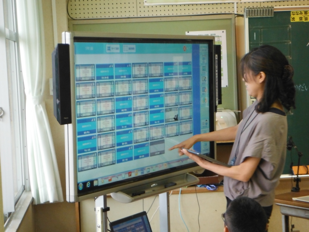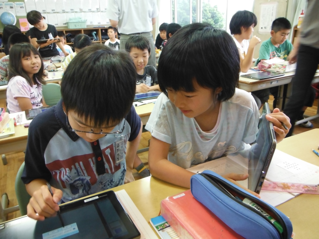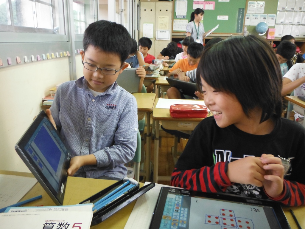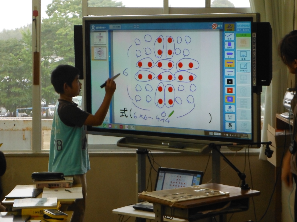 初任者研修の授業として、5年生の古賀先生が算数の授業をされました。今回はタブレット端末を使って、○の数の求め方を考え、その式になった理由を説明する授業でした。子どもたちはそれぞれに考えた求め方をタブレット端末に書き込み、画面転送システムを用いてみんなに分かりやすく説明することができました。