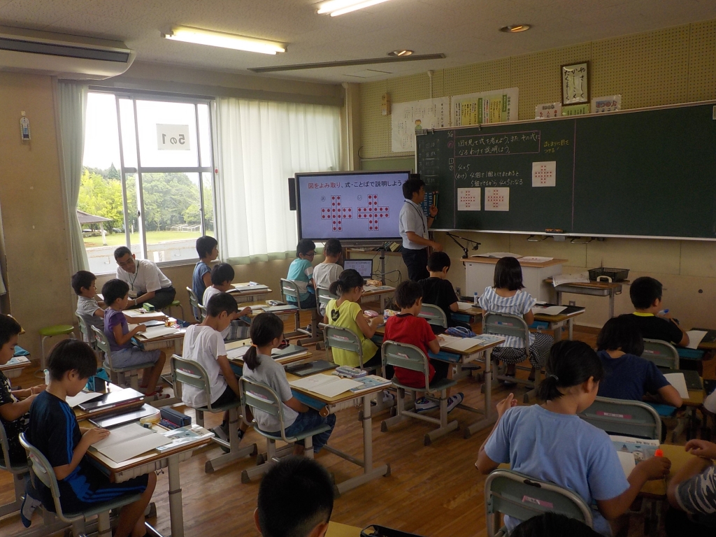 「式と計算」の単元で、個数の求め方を表す式や図を見て、求め方を読み取って説明するというところです。電子黒板での自作のプレゼンを使ったクイズから始まり、問題シートを使って考え、それぞれの考えを発表しました。また、適用題を解く時には、タブレットパソコンを使って、ポイントを書き込みながら考えていました。