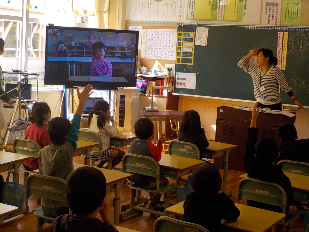 グループ活動や発表場面では、パソコンの画面上だけではなく、電子黒板にも万江小学校の友だちを映したことで、より臨場感のある展開になりました。