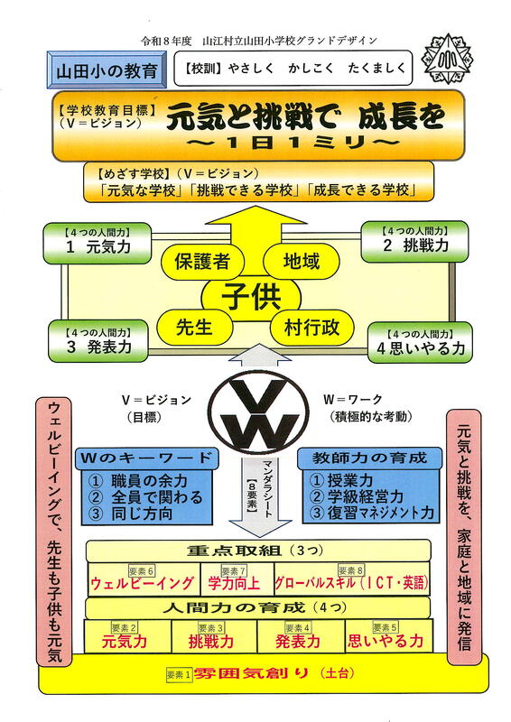 4月15日の職員会議で、職員に本年度の学校経営方針を伝えました。学校経営方針を1枚に分かりやすくまとめたものを「グランドデザイン(GD)」と言います。令和8年度の山田小GDのキーワードは、「ⅤとW」です。メインのV=ビジョン(目標)は、「元気と挑戦で成長を ~1日1ミリ~」です。そして、メインのW(ワーク=積極的な考動)は、「8要素」です。この8つの要素を積極的に考え動きながら、メインのVの達成を目指していきます。保護者の皆様、地域の皆様、村行政の皆様、応援をよろしくお願いいたします。