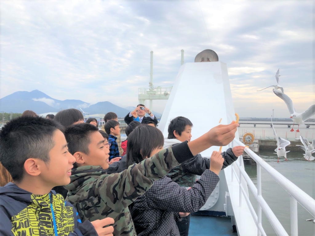たくさん空を飛んでいるカモメに、みんなでえさをあげました。