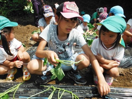 4年生が章鹿倉保育園の園児たちと交流をしました。交流会では、いものつるさしや梅ちぎり、レクレーションなどを行いました。4年生のお兄さんお姉さんとしての姿を見ることができました。秋のいもの収穫が楽しみです。