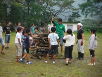 夜は楽しみにしていたキャンプファイヤー。木の組み方を教えてもらいながら自分たちで組み上げました。