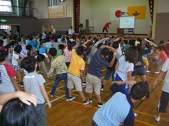 集会の最後には、クリスティーナ先生にも参加いただきながら、なかよし委員会が企画した「みんななかよし ハッピィスマイル集会」を行いました。全児童が縦割り班に分かれ、