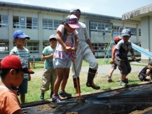以前、ポットに植えた種が芽を出さなかったため、保護者の方が急きょマルチを張っていただき、直播きをした所でした。