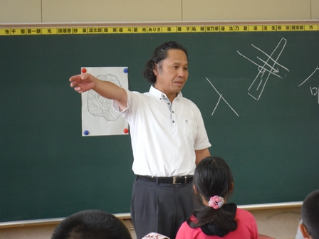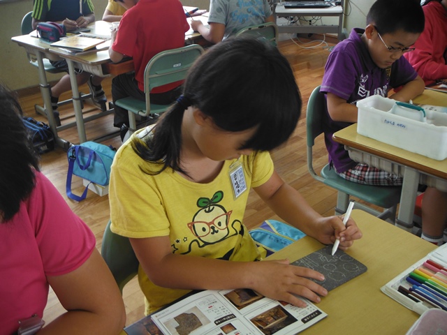 本日は、装飾古墳館の方が来られ、6年生学級で体験教室を開いていただきました。