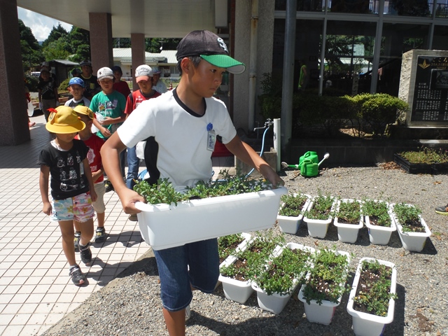 花を植えたプランターを運んだり、地区ごとに各登下校の道路沿いのゴミを