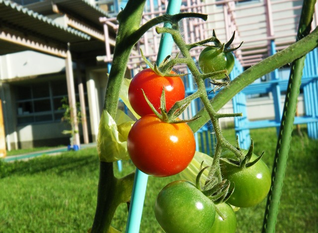 ミニトマトはたくさんの実がなり、赤や黄色に色づき始めています。中には、完全に熟した実もあり、下校前に「おいしい!」「甘い!」と言いながら、食べている子どもたちもいます。自分で育てたミニトマトです。おいしくないわけがありませんね。
