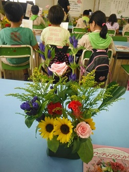 花材は、リンドウ、ひまわり、ケイトウ、バラ等6種類。
