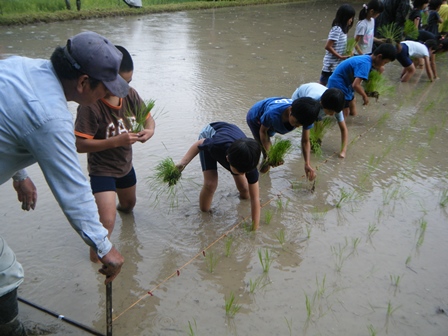 子ども達は、どろんこになりながら、丁寧に苗を植えることができました。